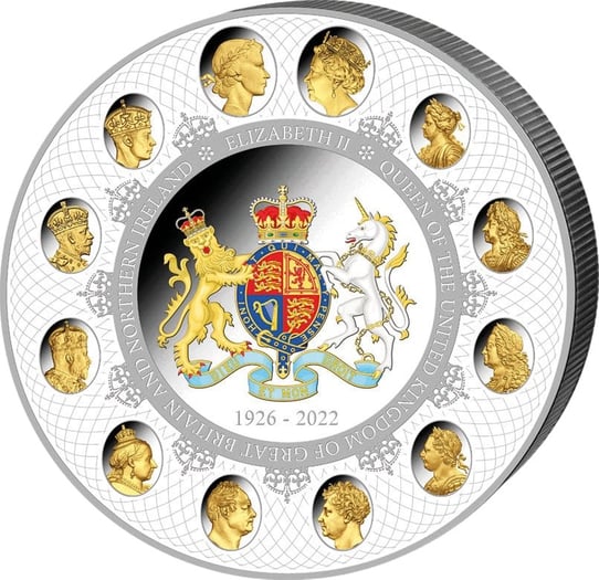 Die exklusive 1 Kg limitierte Silber-Gedenkmünze von Queen Elizabeth II. zeichnet sich durch seine unverwechselbare, edle Ästhetik und sein atemberaubendes Design aus. Beeindruckend ist nicht nur die 5.000-Francs-Stückelung, sondern auch die einzigartige Ausführung. Die Motivseite ist mit dem königlichen Wappen in der Mitte von Elizabeth II. mit ihrem Geburtsjahr verziert, umgeben von Portraits von 10 früher herrschenden Königinnen und Königen. Das Gesicht wird mit den Schriften „ELIZABETH ll. QUEEN OF THE UNITED KINGDOM OF GREAT BRITIAN AND NORTHERN IRELAND“. Auch die reizvolle Rückseite mit einem einseitigen Portrait von Queen Elizabeth ll. und den Worten „Elizabeth ll. 5.000 FRANCS CFA, REPUBLIC OF CAMEROON“ und dem Ausgabejahr 2022.