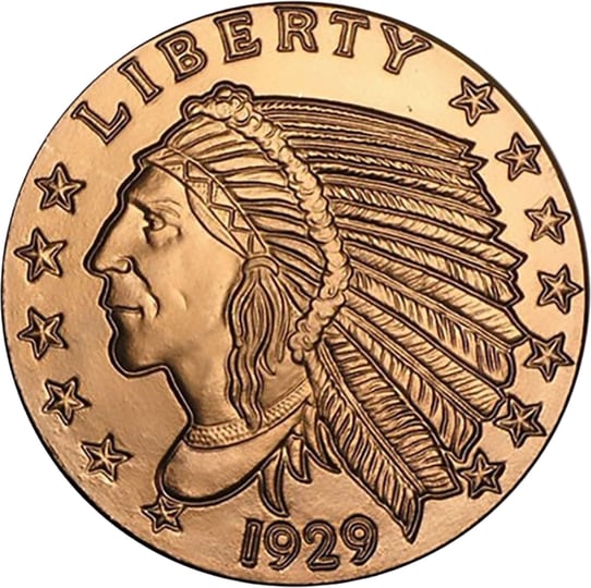Die 1 oz Kupfermünze des Incuse Indian 1929 stammt aus den U.S.A. und wird dort als sogenannte „Copper Round“ oder „Kufpermedaille“ gehandelt. Das Motiv ist in den USA der klare Bestseller und wird ohne Nennwertgeber von einer sog. „Private Mint“ geprägt. Das Pendant zur Kupfermünze ist der goldene Indian Head, welchen es in Gold als 2,5$, 5% und 10$ Münze gibt.