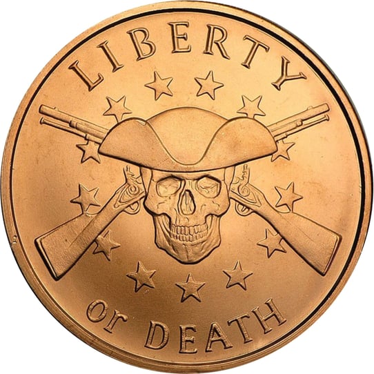 Die 1 oz Kupfermünze Liberty or Death stammt aus den U.S.A. und wird dort als sogenannte “Copper Round” oder “Kufpermedaille” gehandelt. Das Motiv ist in den USA der klare Bestseller und wird ohne Nennwertgeber von einer sog. “Private Mint” geprägt.