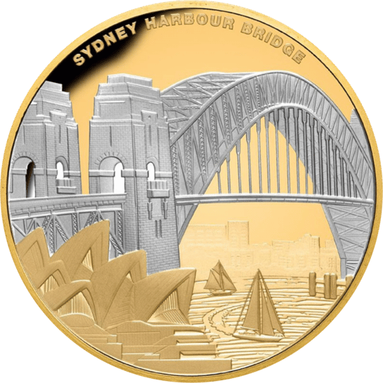Auf dem Motiv der Vorderseite dieser Goldmünze glänzt die Harbour Bridge in einem edlen Silber, wodurch sie sich stark von dem goldenen Hintergrund abhebt. Im Hintergrund wird die Skyline von Sydney angedeutet und im Vordergrund ist das berühmte Opernhaus zu sehen. Das Opernhaus und die Harbour Bridge gelten als Wahrzeichen von Sydney.