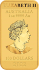 Die Wertseite ist mit einem Bildnis der britischen Queen Elizabeth II. geprägt, so wie mit nötigen Angaben zur Münze. Eingeprägt sind das Herkunftsland (Australien), die Stückelung (1 Unze), die Feinheit (999,9), das Material (Gold), das Prägejahr (2022) und der Nennwert (100 australische Dollar).