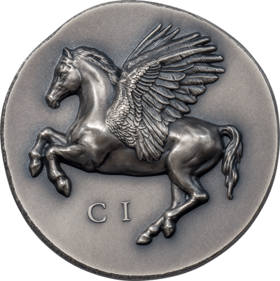 Das Motiv dieser Silbermünze ist Pegasos, ein aus der griechischen Mythologie stammendes geflügeltes Pferd. Das Design im Antik Finish passt perfekt zum antiken und mythologischen Ursprung des Wesens. Der Sage nach sind die Eltern des Pegasos keine geringeren als der Meeresgott Poseidon und die durch ihre Schlangenhaare bekannte Gorgone Medusa. Poseidon ist nämlich auch der Gott der Pferde.