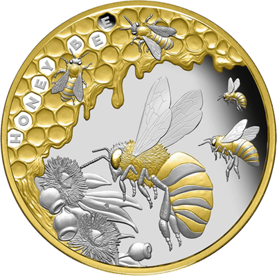 Auf der Motivseite dieser Silbermünze sind drei Honigbienen eingeprägt, die auf eine Blumenwiese zufliegen. Über der Wiese ist der Honig zu sehen, den die fleißigen Bienen hergestellt und gelagert haben. Um die Farbe des Honigs darzustellen, wurde das Honiglager mit hochwertigem Gold veredelt, genauso wie der gelbe Körper der Bienen.