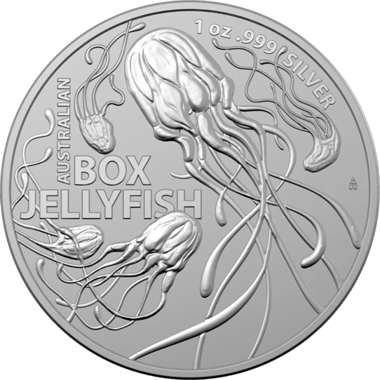 Auf der Vorderseite dieser Silbermünze sind fünf sogenannte Würfelquallen abgebildet, die im englischsprachigen Raum als „Box Jellyfish“ bekannt sind. Dabei handelt es sich um australische Quallen, die äußerst gefährlich sind und auf jeden Fall gemieden werden sollten.
