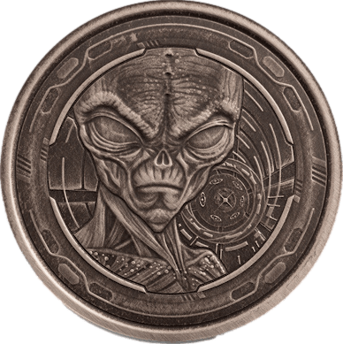 Der große Kopf eines grauen Aliens ist auf der Motivseite dieser Silbermünze eingeprägt. Seine Mundwinkel sind nach unten gezogen und sein Blick sieht finster aus. Allgemein macht er nicht gerade einen freundlichen und wohlgesinnten Eindruck. Mit seinen riesigen Augen blickt er den Betrachter der Münze an, als würde er aussagen wollen, dass er von nichts und niemandem belästigt werden möchte. Es scheint mitten in der Nacht zu sein. Im Hintergrund ist auch eine Art Raumschiff zu sehen. Das Alien ist wohl erst vor kurzem gelandet und muss sich auf der Erde natürlich erst einmal zurechtfinden und sich an Menschen gewöhnen. Vielleicht ist er auch auf einer geheimen Mission auf die Erde gekommen und möchte deshalb nicht gesehen und gestört werden. Das detaillierte Design des Alien-Kopfes sieht so echt aus, dass es einem wirklich leicht fällt, sich eine Hintergrundgeschichte für das Alien zu überlegen und sich vorzustellen, wie es denn eigentlich wäre, wenn einem wirklich einmal ein Alien begegnet. Das Antik Finish trägt dazu bei, dass das Design noch mystischer und geheimnisvoller wirkt.