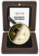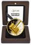 Geliefert wird diese Rarität in einer hochwertigen Holzschatulle aus dunklem Holz mit sichtbarer Maserung und matter Oberfläche. Im Inneren bettet schwarzer Samt die Münze sicher und repräsentativ ein. Im Deckel der Box befindet sich – gehalten von einem schwarzen Satinband – das nummerierte Echtheitszertifikat von Kettner Edelmetalle. Jedes einzelne Exemplar trägt seine individuelle Nummer (001/250 bis 250/250), was die Exklusivität zusätzlich unterstreicht. Ein goldener Druckknopf-Verschluss rundet die edle Verpackung ab.