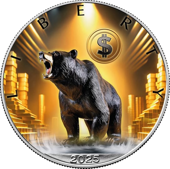 Das aufwendig colorierte Motiv zeigt einen mächtigen, brüllenden Bären vor einem goldenen Hintergrund mit dem markanten Dollar-Symbol. Diese symbolträchtige Darstellung repräsentiert den sogenannten "Bärenmarkt" - ein Begriff aus der Finanzwelt für fallende Kurse. Die Rückseite ziert der majestätische Weißkopfseeadler, das Wahrzeichen der Vereinigten Staaten, mit einem Eichenzweig in seinen Klauen.