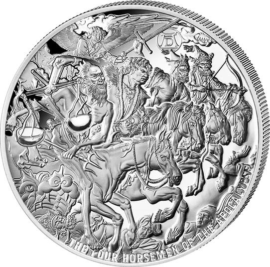 „Die vier apokalyptischen Reiter" von Albrecht Dürer gilt als eines der einflussreichsten Kunstwerke der europäischen Geschichte – und diese Silbermünze macht es erstmals in dreidimensionaler Pracht greifbar.