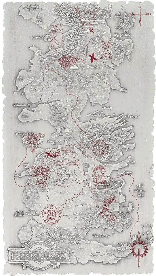 - Motiv: Detailgetreue Karte von Westeros mit topografischen Reliefstrukturen, den Wappen aller großen Häuser und farbigen Akzenten in Rot – ein Meisterwerk der Prägekunst