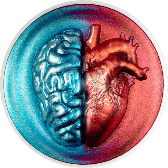 Kopf oder Herz? Vernunft oder Leidenschaft? Dieser uralte menschliche Konflikt wurde auf der Motivseite dieser außergewöhnlichen Münze in eine visuelle Sprache übersetzt, die schlicht überwältigt. Die linke Hälfte zeigt ein anatomisch detailliertes menschliches Gehirn, getaucht in kühle, metallisch schimmernde Blautöne – ein Sinnbild für Logik, Rationalität und analytisches Denken. Die rechte Hälfte hingegen offenbart ein pulsierendes Herz in warmen, satten Rottönen, das für Emotion, Intuition und Leidenschaft steht.