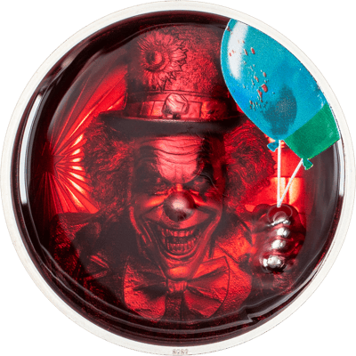 Meisterhafte Kunstprägung: Furchteinflößender Horror-Clown im ultrahohen Relief mit Emaille-Veredelung und intensiver Kolorierung in Polierter Platte