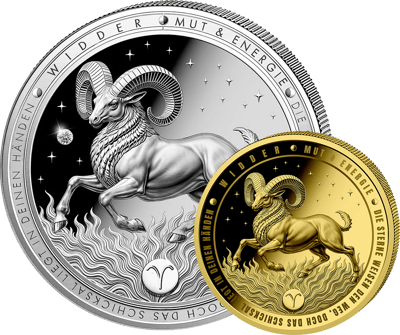 Diese eingravierte Randinschrift ist nicht weniger als ein Leitspruch – und passt kaum zu einem Sternzeichen besser als zum Widder. Auf der Wertseite begegnet dem Betrachter das komplette astrologische Universum: „Zwölf Zeichen, vier Elemente, ein Universum“, begleitet von Sonne, Mond, tosenden Wellen und zerklüfteten Bergen. Ausgegeben wird die Goldmünze als 25-Dollar-Gedenkmünze der Republik Liberia, geprägt in Deutschland nach strengsten Qualitätsmaßstäben.