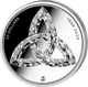 Auf der Wertseite erwartet Sie das markante Triquetra-Symbol, der keltische Dreiheitsknoten. Dieses uralte Zeichen steht für die Verbindung von Körper, Geist und Seele – oder, je nach Deutung, für Vergangenheit, Gegenwart und Zukunft. Die facettierte Darstellung lässt das Symbol geradezu plastisch aus dem Münzrund hervortreten.