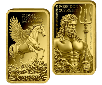 Zwei kleine, aber feine Münzbarren aus Liberia bilden dieses Set. Jeder einzelne ist ein Mikrokunstwerk – und gemeinsam erzählen sie von göttlicher Macht über die Meere und vom geflügelten Ross, das sich in die Lüfte erhebt.