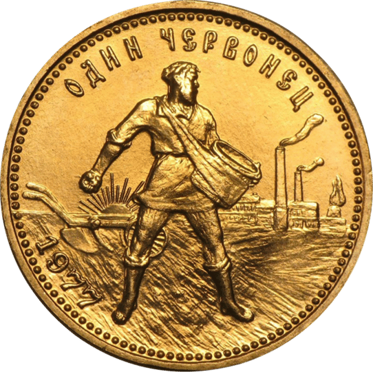 Auf der Vorderseite der geschichtsträchtigen Goldmünze findet sich einen Bauern aus Zeiten der Sowjetunion. Er hält einen Behälter in der Hand, der von einem Tuch um seinen Hals stabilisiert wird. Er findet sich auf dem Feld und erntet. Im Hintergrund sind Fabriken mit qualmenden Schornsteinen zu sehen. Unter dem rechten Arm scheint die untergehende oder aufgehende Sonne hervor. Die Münze wurde im Jahr 1977 geprägt. In der direkten Übersetzung steht Tscherwonez für die rote Münze. Auf der Rückseite findet sich das Wappen der RSFSR und damit der Russischen Sozialistischen Föderativen Sowjetrepublik. Im Zentrum der Goldmünze finden sich Hammer, Sichel und der Ehrenkranz und damit die Sinnbilder des Sozialismus.
