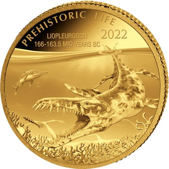 Die Münzserie Prehistoric Life ist Tierarten gewidmet, die vor einer langen Zeit gelebt haben und heute nicht mehr existieren. Zu den Tierarten gehören einige Dinosaurier-Arten, wie zum Beispiel der T-Rex. Auf der Motivseite dieser Goldmünze ist der Liopleurodon zu sehen. Dieser ist das achte Motiv der Reihe.
