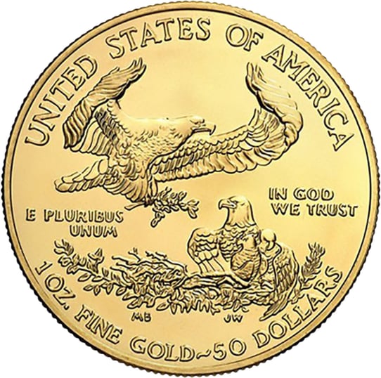 Die Rückseite der Münze zeigt einen Weißkopfseeadler im Flug, ein Symbol für Stärke und Freiheit. Unter dem Adler sind das Münzgewicht, der Nennwert und das Edelmetall "Fine Gold" eingeprägt. Die Inschriften "United States of America", "IN GOD WE TRUST", "E PLURIBUS UNUM" und die Initialen des Designers Miley Busiek "MB" sind ebenfalls auf der Rückseite zu finden.