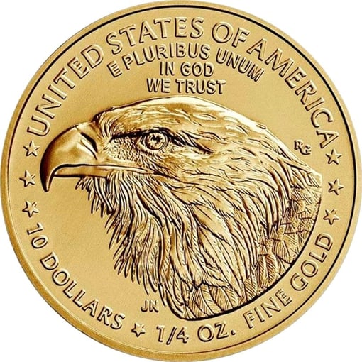 Die Vorderseite dieser Goldmünze ist mit dem Kopf eines Weißkopfseeadlers geprägt. Schließlich handelt es sich bei dieser Münze um eine American Eagle Münze, die von dem US-amerikanischen Hersteller US Mint hergestellt wurde. Die American Eagle ist eine klassische und begehrte Anlagemünze. Der Weißkopfseeadler symbolisiert sowohl die USA als auch den Begriff der Freiheit. Der Vogel ziert zudem das Wappen der USA. Über dem Kopf des Adlers steht das offizielle Motto der Vereinigten Staaten. Dieses lautet: „In God we trust.“