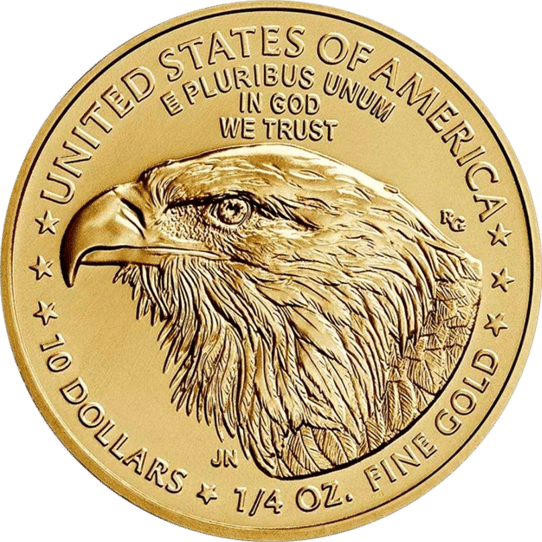 Die Vorderseite dieser Goldmünze ist mit dem Kopf eines Weißkopfseeadlers geprägt. Schließlich handelt es sich bei dieser Münze um eine American Eagle Münze, die von dem US-amerikanischen Hersteller US Mint hergestellt wurde. Die American Eagle ist eine klassische und begehrte Anlagemünze. Der Weißkopfseeadler symbolisiert sowohl die USA als auch den Begriff der Freiheit. Der Vogel ziert zudem das Wappen der USA. Über dem Kopf des Adlers steht das offizielle Motto der Vereinigten Staaten. Dieses lautet: „In God we trust.“