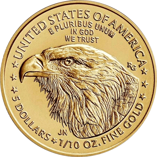 Auch die Motivseite dieser Goldmünze ist sehr US-amerikanisch, denn auf ihr ist das Wappentier der USA abgebildet, nämlich der Weißkopfseeadler. Genauer gesagt der Kopf des Tieres. Über dem Motiv finden Sie außerdem das Motto der USA „In God we trust“ sowie deren Wahlspruch „E pluribus unum“ (zu Deutsch: „aus viel wird eins“). Die Motivseite ist auch mit dem Nennwert der Münze geprägt (5 USD) und mit der Stückelung des Produkts (1/10 Unze).