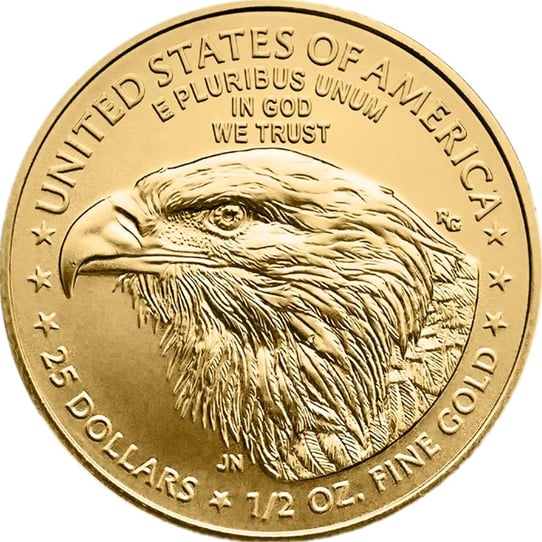 Auf der Vorderseite der Münze thront majestätisch der Adlerkopf, umgeben von den Inschriften „United States of America“, dem Nennwert von 25 USD und dem Feingewicht von 1/2 Unze. Über dem Adlerkopf sind die Schriftzüge „E Pluribus Unum“ und „In God We Trust“ zu lesen, die die Münze zusätzlich zu einem Symbol amerikanischer Werte machen.