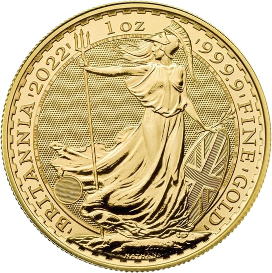 Mit Dreizack, englischem Schild und elegantem Helm steht Britannia selbstbewusst auf einem Fels in der Nähe des Meeres der englischen Küste. In der Hand in der sie ihr Schild hält, das für ihre Funktion als Schutzfigur Großbritanniens steht, hält sie außerdem einen Olivenzweig. Die Münze besitzt auf der Vorderseite die Aufschriften „Britannia 2022“ und „1 OZ 9999 FINE GOLD“.