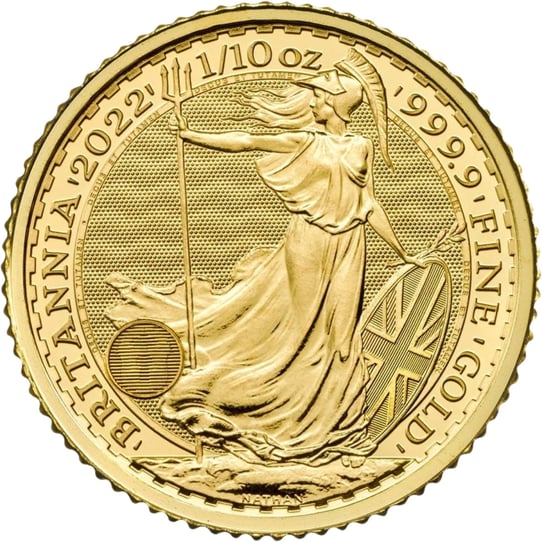 Das Motiv der Britannia als Frauengestalt mit Schild wurde seit 2001 alle zwei Jahre abgewandelt und beruht ursprünglich auf das Design von P. Nathan. Der Namensursprung lässt sich auf die lateinische Bezeichnung Großbritanniens zurückführen. Die kriegerische Frauengestalt in Rüstung ist Symbol für die Verehrung und Patriotismus des Landes (vgl. Germania). Die Bezeichnung wird auch als Firmen- und Schiffsnamen verwendet, fand aber auch schon zuvor die Erwähnung auf Münzen. Das Motiv wird umgeben von den Inschriften „BRITANNIA 2022 1/10oz 9999 FINE GOLD. Die Rückseite ziert das bekannte Porträt der Königin Elizabeth II mit den Angaben: „Elizabeth II – D – G- REG – F – D – 10 POUNDS„.