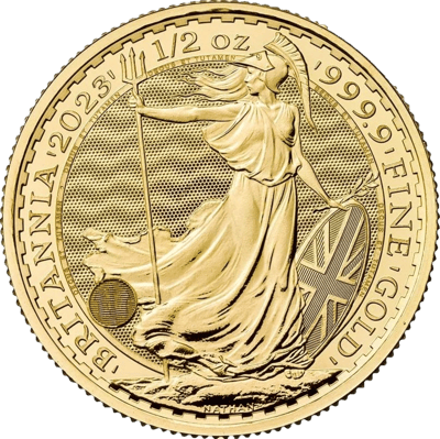 Auf der Motivseite dieser Goldmünze finden Sie nicht nur das Britannia-Motiv, sondern auch die wichtigsten Daten zum Produkt. Es ist sowohl das Prägejahr (2023), als auch die Stückelung (1/2 Unze) und die Feinheit von 999,9/1.000 eingeprägt. Den Nennwert finden Sie auf der Wertseite. Dieser beträgt 50 britische Pfund. Weitere Daten, die nicht auf der Münze eingraviert sind, aber Sie dennoch interessieren könnten, sind der Durchmesser von 27 Millimeter und das Gewicht von 15,55 Gramm.