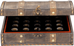 Die 100 Goldmünzen werden in einer aufwendig gestalteten Holzschatulle geliefert, die an historische Schatztruhen erinnert. Mit ihren kunstvollen Metallbeschlägen, dem authentischen Ledergürtel und dem dekorativen Verschluss ist sie selbst bereits ein Schmuckstück. Das schwarze Einlage-Tableau mit goldfarbenen Einfassungen bietet den perfekten Rahmen für Ihre wertvollen Münzen.