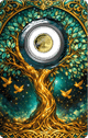 Geliefert wird die Münze in einer aufwendig gestalteten Coincard, die ihresgleichen sucht. Die Vorderseite zeigt eine kunstvolle Illustration des Lebensbaums in leuchtenden Grün- und Goldtönen, umrahmt von keltischen Ornamenten und goldenen Vögeln vor einem mystischen Sternenhimmel. Die Münze selbst thront geschützt in einer Kapsel im Zentrum der Karte. Ein Sammlerstück, das man nicht in den Tresor verbannen möchte – sondern am liebsten ausstellen würde.
