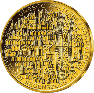 - Motiv: Die Münze zeigt eine beeindruckende Darstellung der historischen Altstadt von Regensburg.