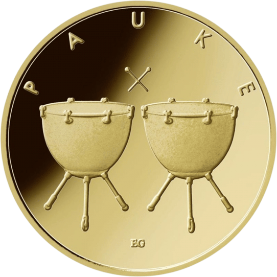 Exquisite Sammlermünze: Die 1/4 Unze Gold 50 Euro Pauke 2021 mit dem Prägebuchstaben J ist ein kulturelles Sammlerstück und eine Hommage an die deutsche Musikgeschichte