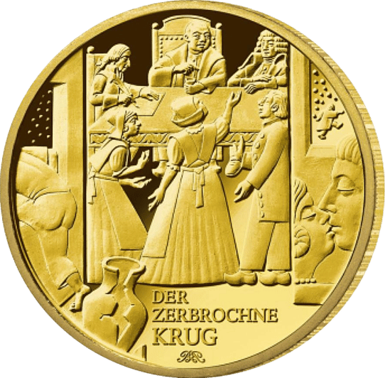 Das Motiv der Münze zeigt eine meisterhaft gestaltete Gerichtsszene aus Heinrich von Kleists berühmtem Lustspiel. Im Zentrum der triptychonartigen Komposition steht der Dorfrichter Adam, umgeben von weiteren Charakteren des Stücks. Der titelgebende zerbrochene Krug ist prominent im Vordergrund platziert und symbolisiert den zentralen Konflikt der Geschichte.