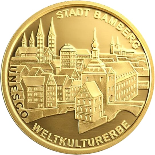 Viele Anleger wissen nicht, dass die deutschen Prägeanstalten das Gold für diese Münzreihe exklusive aus dem Reservebestand der deutschen Bundesbank erhalten hat. Auf der Vorderseite der 100 Euro Goldmünze ist ein typischer Ausschnitt der Altstadt Bamberg zu sehen. Oberhalb des Stadtausschnittes findet sich der Name „STADT BAMBERG“. Unter der Stadt und förmlich in den Fluss Regnitz fließend findet sich der Verweis „UNESCO WELTKULTURERBE“. Die Rückseite zeigt den Bundesadler, der mit seinem Kopf links aus der Münze blickt. Er ist linksseitig von 12 Sternen, sowie dem Schriftzug „BUNDESREPUBLIK DEUTSCHLAND“ umrandet. Unter dem Adler finden sich der Nennwert „100 EURO“, das Kürzel der Prägestätte und das Prägejahr „2004“.