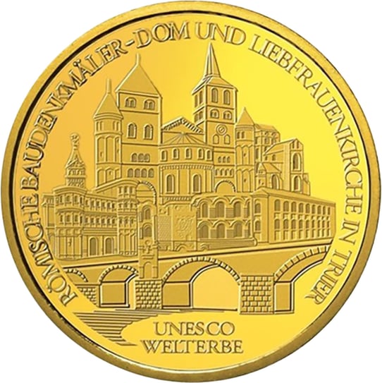 - Motiv: Die Münze trägt die Aufschrift "UNESCO Welterbe - Stadt Trier" und zeigt die historischen Baudenkmäler von Trier, darunter die Liebfrauenkirche, den Trierer Dom, die Porta Nigra, die Igeler Säule, die Konstantinbasilika und die Kaiserthermen.