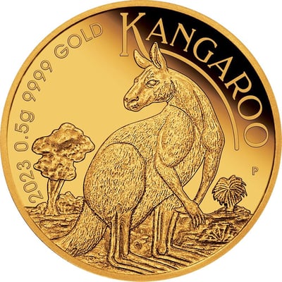 Auf der linken Seite neben dem Känguru-Motiv sind ein paar Informationen zur Münze eingeprägt. Ganz unten steht das Prägejahr (2023), gefolgt vom Gewicht des Produktes (0,5 Gramm). Die Feinheit der Münze beträgt 999,9/1.000. Auf der rechten Seite finden Sie den Namen der Münze (Kangaroo) und daneben den Buchstaben P. Dieser steht für Perth Mint.