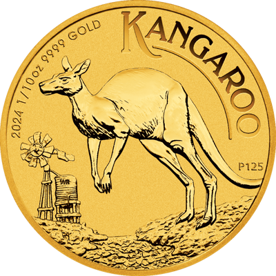 Die Vorderseite der Münze ziert ein springendes Känguru, umgeben von der weiten Landschaft des australischen Outbacks, repräsentiert durch eine Windmühle und einen Wassertank. Über dem Känguru prangt stolz der Schriftzug "KANGAROO" und darunter das Prägejahr "2024". Die Detailgenauigkeit, mit der das Känguru und die Szenerie eingefangen sind, zeugt von der meisterhaften Prägung durch die Perth Mint. Am Rande der Münze finden sich zudem die Angaben zum Feingehalt "1/10oz 9999 GOLD", was die Reinheit und Qualität dieser Anlagemünze unterstreicht.
