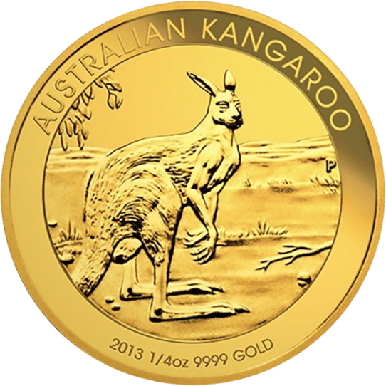 Die 1/4 Unze Australian Kangaroo Münze 2013 ist die 7,777g schwere Goldmünze der Serie des australischen Kängurus, die es seit 1986 gibt und zuvor auch als Australian Nugget bekannt war. Die ersten beiden Jahre der Serie wurde ein Goldnugget auf der Vorderseite abgebildet, ab 1988 folgte dann die Umstellung auf das Känguru.
