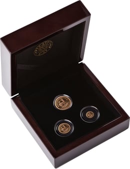 • Drei Goldmünzen in höchster Prägequalität PP mit edler Holzschatulle und Zertifikat