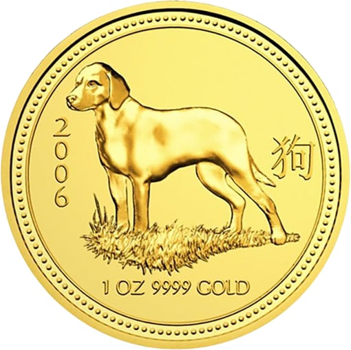 In China gelten Hunde als tüchtig und aufopferungsvoll. Als es zur 11. Stelle des Mondhoroskops kam, mussten die Herausgeber der Lunar-Serie I eine Entscheidung treffen:  Welche Rasse sollte es werden? Die Wahl der Designer fiel bei der Goldversion auf den Jagdhund. Ruhig, in voller Größe und beinahe erhaben steht er auf einer detailgetreu herausgearbeiteten Grasfläche, den Kopf nach links gerichtet. Daneben wurden die einzelnen Ziffern des Prägejahres untereinander, rechts vom Schwanz das chinesische Schriftzeichen für den Hund platziert. Unterhalb der Grasfläche sind Feingoldgehalt sowie die Stückelung der Münze angegeben: „1 oz 9999 Gold“. Ein Doppelrand mit einer innenliegenden Punktreihe rundet das wunderschöne Motiv ab.