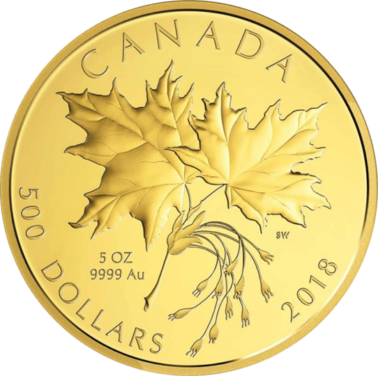 Die Vorderseite dieser Sonderedition zeigt zwei atemberaubend lebendig wirkende Ahornblätter, welche die Aufschrift "CANADA", "500 DOLLARS" und "2018" sowie die Angabe "5OZ 9999 Au" umgeben. Die Rückseite zeigt das Portrait der Königin Elizabeth II mit der Aufschrift "ELIZABETH II" und "D(ei) G(ratia) Regina".