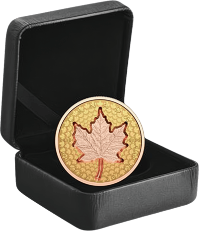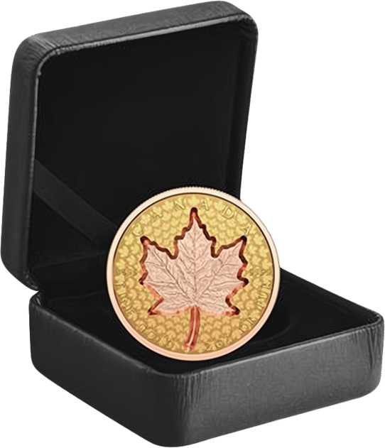 1. Das Ahornblatt und auch der Münzrand wurden mit Roségold veredelt, so entsteht ein kontrastreicher Effekt.
