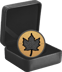 Um genauso eine Sonderausgabe handelt es sich bei dieser Goldmünze. Auch, wenn Sie hier eine Goldmünze sehen, so scheint jedoch nur der Hintergrund golden zu sein. Das liegt daran, dass das bekannte Zuckerahornblatt-Motiv mit Rhodium veredelt wurde. Das führt dazu, dass das Motiv in einem edlen schwarz glänzt. Tatsächlich glänzt und strahlt das Motiv, der goldene Hintergrund wirkt im Vergleich zum Motiv jedoch matt. Das ist der Reverse Proof Technik zu verdanken und unterstreicht noch einmal den Kontrast, der durch die unterschiedlichen Farben erzielt wurde. Des Weiteren wurde das Zuckerahornblatt-Motiv um 1,5 mm vertieft. Der Rand des Motivs ist daher sehr deutlich zu erkennen. Direkt neben dem Motiv finden Sie die Feinheit des Produktes: 999,9. Rechts unter dem Motiv wurde die Stückelung eingraviert: 2 Unze. Da diese Goldmünze eine Sammlermünze ist, ist die Gesamtauflage auch limitiert. Es sind weltweit nur 275 Exemplare erhältlich.
