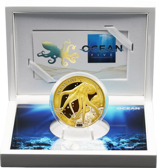 Die 5 Unze Gold Ocean Five Oktopus 2023 PP ist mehr als nur eine Münze - sie ist ein wahres Sammlerstück und eine hervorragende Wertanlage. Mit ihrem beeindruckenden Oktopus-Motiv und der Polierten Platte (PP) Prägequalität, ist sie ein echter Blickfang und eine Bereicherung für jede Sammlung. Gleichzeitig bietet sie durch ihre Goldbasis und ihre hohe Feinheit eine stabile und bewährte Wertanlage, die vor Kaufkraftverlust schützt.