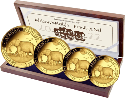 Erstehen Sie mit diesem Prestige Set bestehend aus 4 streng limitierten Goldmünzen ein herausragendes Goldmünz-Set mit dem Motiv des Somalia Elefanten. Das Motiv ändert sich jährlich. Der aus 99,99% reinem Gold geprägte und streng limitierte Prestige-Satz des Somalia Elefant 2022 besticht durch das Motiv und durch die höchste Prägequalität der polierten PLatte. Mit diesem Satz erstehen Sie vier 2022er Gold-Ausgaben der beliebten African Wildlife Serie.
