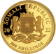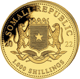 Die Rückseite zeigt Ihnen auf jeder der Münzen das Wappen der Republik Somalia, das von zwei detailliert gezeichneten Leoparden gehalten wird. Auch das Jahr 2022 ist in das Feingold eingeprägt. Die Aufschrift auf der Unterseite der Münze zeigt, dass die Münze auch als gesetzliches Zahlungsmittel von 1,000 Schilling, 500 Schilling, 200 Schilling bzw. 100 Schilling verwendet werden könnte.