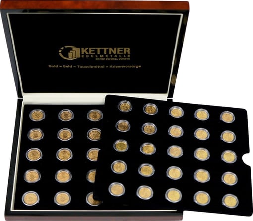 Edle Gold Vreneli Box mit 50 Münzen, inklusive Etui