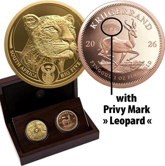 2 x 1 Unze Gold Big Five III & Krügerrand Satz – Privymark Leopard 2026 | Polierte Platte