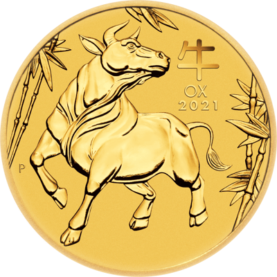 Das Motiv der Münze zeigt einen muskulösen Ochsen, der kraftvoll und selbstbewusst nach links blickt, umgeben von sanft neigenden Bambusstangen – ein Sinnbild für Ruhe und Ausgeglichenheit. Das chinesische Schriftzeichen für "Ochse" neben dem Tier und das Prägejahr "2021" unterstreichen das thematische Design, während der Buchstabe "P" die Perth Mint als Herkunft kennzeichnet. Der glänzende, goldene Glanz macht jede dieser Münzen zu einem wahren Blickfang und einem Zeugnis höchster Prägekunst.
