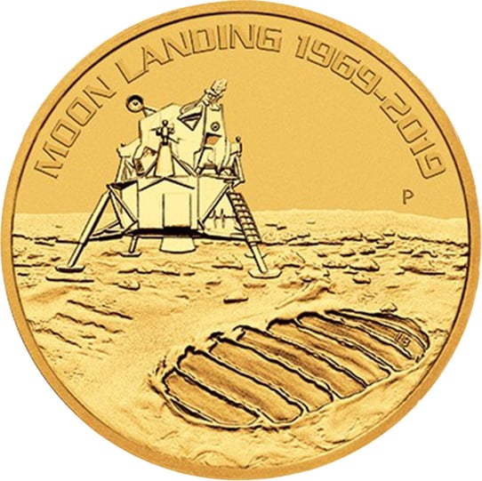Auf der Bildseite der Münze ist eine Darstellung der Mondlandefähre zu sehen, welche hinter einem großen Abdruck auf der Mondoberfläche landet. Die Gold-Unze hat einen Durchmesser von 32,60 Millimetern.